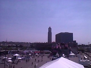 I continued on over the suspension bridge. A parking lot full of events and booths stretched out towards the Metro Clock Tower. And yes . . . people were beginning to cross the bridge. I stood on the bridge and took a few snaps before the lot filled.